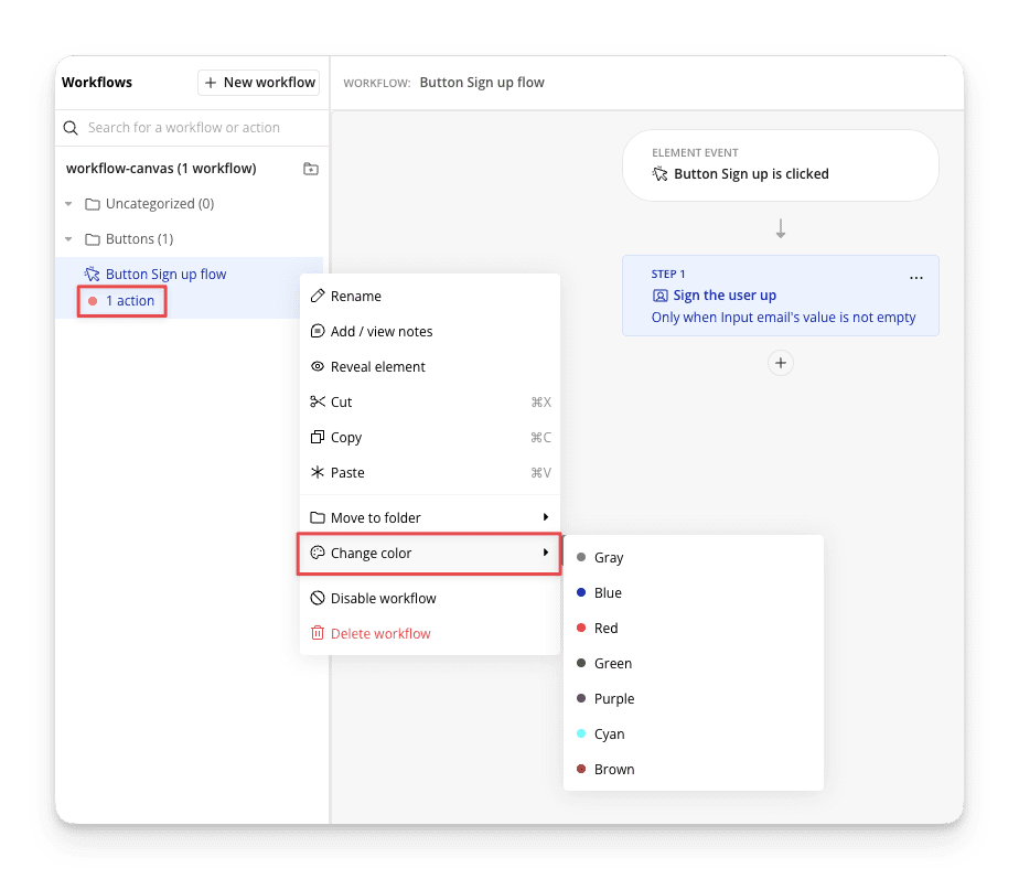- In the workflow, choose “Sign the user up” and connect the inputs.