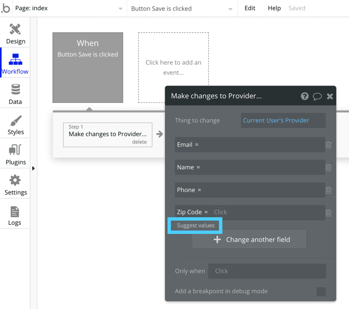 - Workflows – The “brains” of your app. Workflows tell Bubble what to do when a user clicks a button, submits a form, or loads a page.