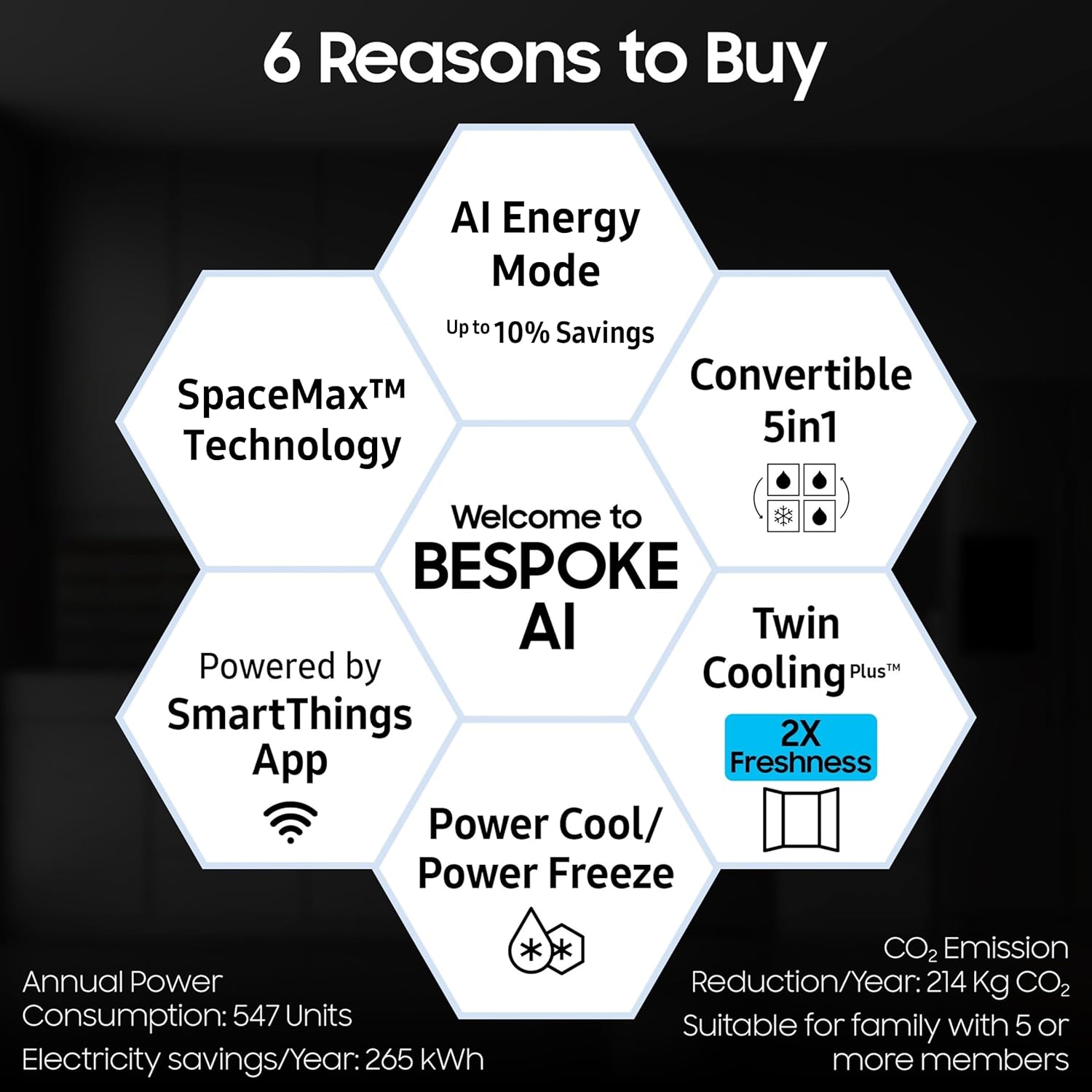 - Special Features : Bespoke AI | Convertible 5-in-1 | Twin Cooling Plus| Wi-Fi Embedded | Smart Things App | Smart Things AI Energy Mode | Power Freeze | Power Cool | Fingerprint Resistant | Built-in Look